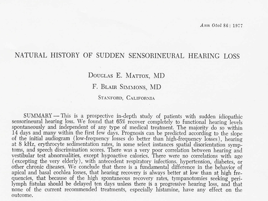 Probably the best (and nowadays likely the only) study of what happens to people with a sudden onset of a hearing loss was performed by Doug Mattox and Blair Simmons in the USA in the 1970s. In a large hospital setting and the surrounding townships they let it be known that they would see any one with a sudden hearing loss immediately and all the individual had to do was turn up in the department. The patient had a hearing test and was then observed with serial audiograms until the hearing recovered or did not. No treatment was given to this group. The authors found that 65% of their patients recovered completely within two weeks and another 15% recovered more or less completely during this time. The maximal rate of recovery was within the first few days.