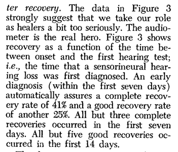 In fact, not all the patients had steroids. Of the 458 patients in the trial all had audiograms but 33 did not have steroids. There are no details about the duration of the hearing loss in the 33 who did not have steroids although this group had 20% complete recovery which was the same as the group who had steroids more than 14 days after onset – 19% recovery.