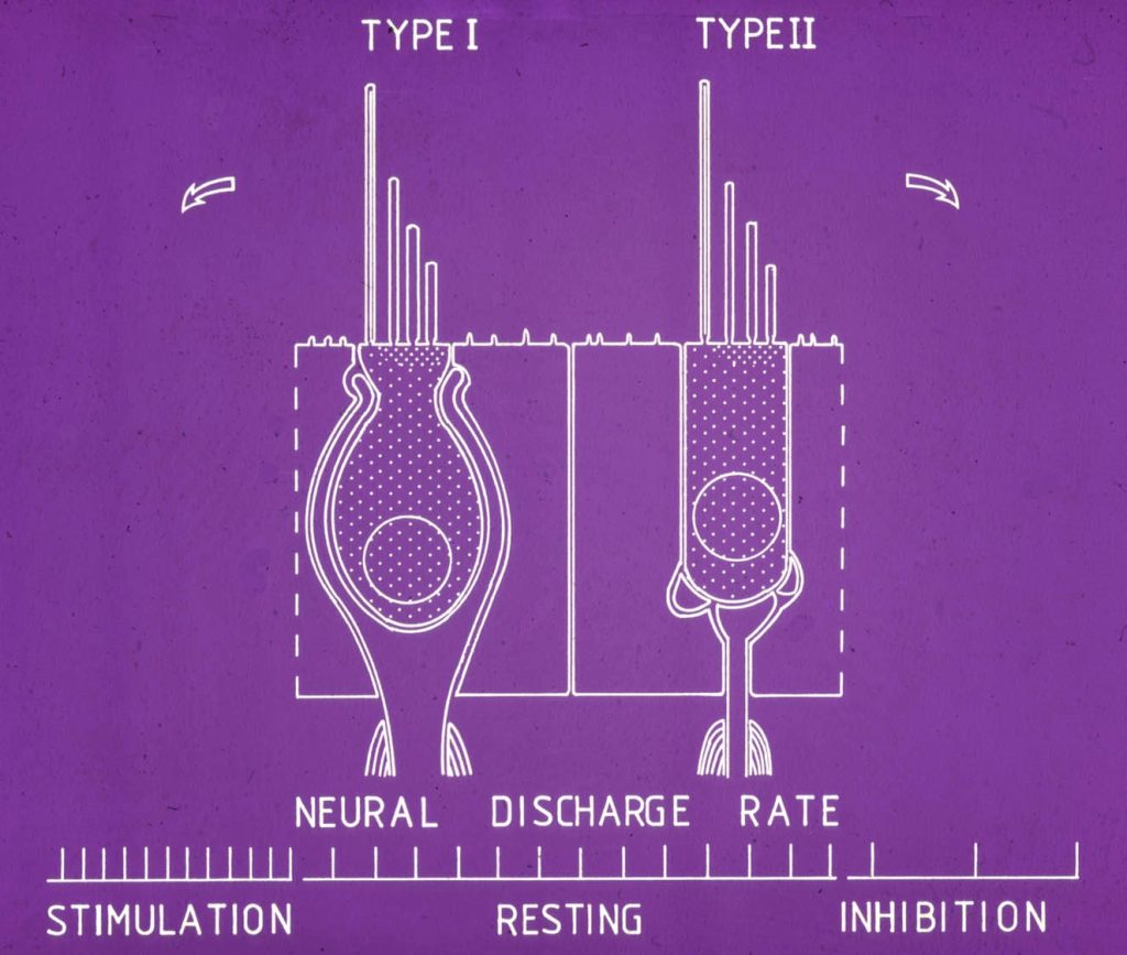 The sensory cells of the balance system are essentially the same in the two parts that detect linear or angular movements. The cell body is either flask shaped or cylindrical and has hair like structures projecting form their upper surfaces. Deflection of the hair bundle in one direction results in stimulation and an increased neural out put whilst deflection in the opposite direction results in suppression and a reduced output. Thus the cells have “polarity” in that they can “tell” which way they are being moved.
