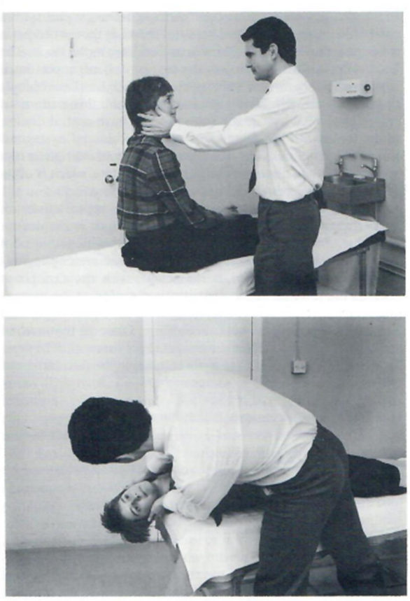 The history is of vertigo – i.e. a sensation of unreal movement – that lasts for a while, not moments- and which may be associated with nausea. Its onset is associated with some turning movement but this may be obscured in the history. The general ENT and neurological examination is usually normal but the Hallpike test is often positive. In this test the patient is sat upon a couch with the doctor standing on one side. The patient’s head is held by the doctor and turned so that their eyes meet. The patient is then rapidly laid back so that their head is turned to one side, lying below couch level and their eyes are looking into the examiner’s eye. This is illustrated by diagrams a and b below.