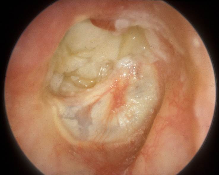 One common and potentially dangerous condition of the middle ear and mastoid is called cholesteatoma. The name of the condition is not very helpful to understand what is taking place in the ear or what damage can be caused by the failure to diagnose and treat this disease. The suffix – oma as in lipoma, fibroma, and carcinoma comes from the Greek ωμα, meaning a swelling. The prefix defines the type of swelling and in the case of a cholesteatoma means a creamy coloured mass.
