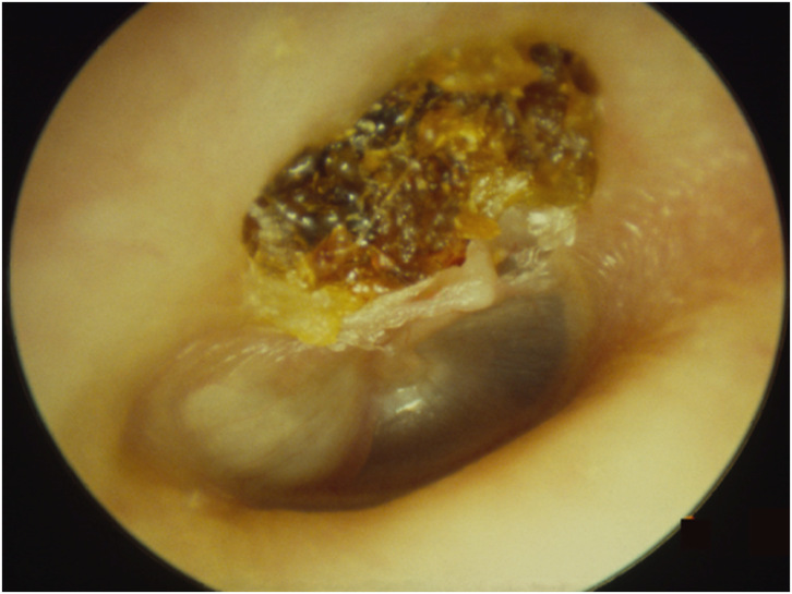 Above: The retraction pocket has become filled with keratin which has turned brown. This resembles wax – but is not; hence the old adage “Beware attic wax for beneath is disease”.