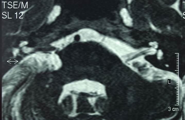 The management of this difficult condition needs a team approach with ENT surgeons, and neurosurgeons working alongside hearing therapists, genetic counsellors and a social support network to deal with the problems as they arise. The MRI scan below shows large bilateral acoustic neuromas. The tumour on the right side had been partly decompressed but there is now clear brain stem compression and the risk of hydrocephalus.